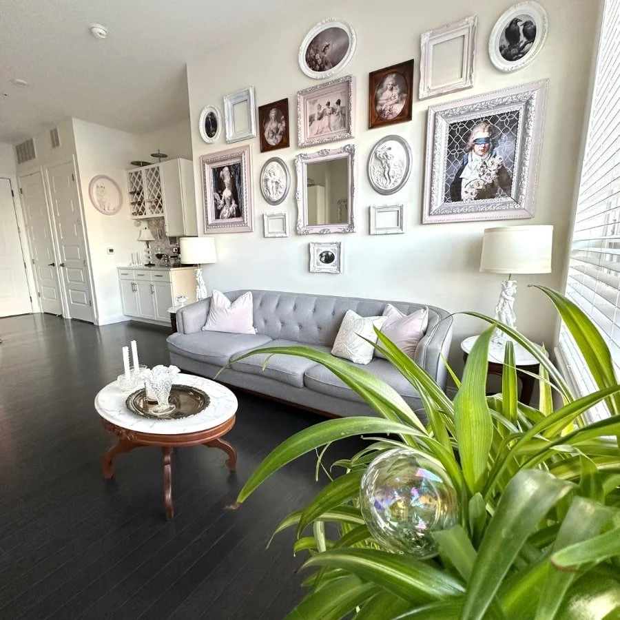 Goodbye thrift anxiety, hello thrifting adventure! This spider plant on its fancy crystal cake stand with a statement mirror and chic candlesticks? Just a little proof that once you get past the jitters, thrifting becomes your playground for adding all sorts of fabulous finds to your apartment!
